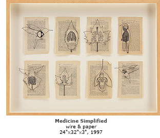 Rhein uses thin, pliant wire to "draw" in air. He does this exquisitely in his "Leaves" series: a group of now over 200 contour drawings of individual leaves done in wire, mounted against plain white paper, so that the shadow of the leaf becomes part of the effect of the work. Each leaf is a commemoration to a dead person or friend associated with the artist's life. It is apparent here we are all like leaves: individual, temporary in existence, worthy of notice, and yet part of a great whole, from a tree that is part of a system that is part of the earth's structure. Another motif in Rhein's work is the hummingbird; he is enchanted with these tough, exquisite little feathered-jewels. The Aztecs, he tells us, believed that hummingbirds contain the "reincarnated spirits of warriors." The hummingbird has become his own symbol in his own war against HIV, as he has been thrust, like so many AIDS survivors, into that Underworld of death itself—in 1995 at close to 6 feet he was down to 127 pounds, his T-cells were down to 4, his body was riddled with an aggressive candida fungus that had attacked his bone marrow, and he was told that any kind of physical activity could lead to his death. He expected to die at any moment, yet went on making art. Less than a year later, he was accepted into one of the first protease-inhibitor programs. In a Lazarus-like series of reversals from death, his life was saved, although it is not possible to credit this miracle only with medicine and chemicals.