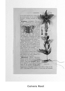 Using rhinestones, jewelry clasps, bronze wire and antique items and even pages from biology textbook, the New York artistÑwho's gaining much attention among art cognoscenti thereÑweaves poignant but also humorous stories in each of his small, subtle wall works that may remind viewers of Joseph Cornell's box assemblages. Elliptical and elegant, Rhein's exactingly rendered structures seem like memory pieces or visual diary entries and touch on many topics, including the biology of destiny and, ever so gently, AIDS.