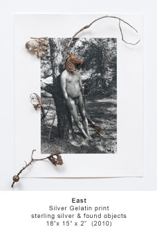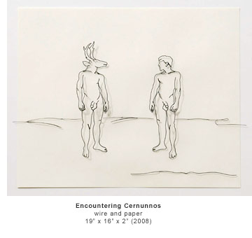 Opening February 12, 2011, BoxoFFICE gallery will feature work by artist Eric Rhein. The exhibit will run February 12 thru April 9, 2011. Eric Rhein, a native of New York's Hudson Valley, and resident of Manhattan, is known for his refined and passionate wire drawings which combine human forms with animal and plant life. He weaves personal stories, experiences, and mysticism into explorations of the powerful connections among man, nature, and the spiritual world. Rhein's own photographs (often taken on Fire Island), as well as vintage photography of male nudes, are combined with found objects, as well as bronze & silver castings of Leaves & twigs. These assemblages, like Rhein's other works, depict a sense of humanity's communion with nature, and evoke figures from Celtic and Egyptian mythology.