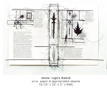 Based in Manhattan, Eric Rhein has been exhibiting his sculptures and wire drawings for over 20 years in New York, elsewhere in the U.S., and in London, Paris, Munich, Stockholm, and Tokyo. Publications that have reviewed and/or reproduced his artwork include Art in America, Interview, the New York Times, Village Voice, Metrosource, POZ, the James White Review, Dutch Elle, and Vanity Fair. Rhein holds an MFA from the School of Visual Arts. He has received grants from the Pollock/Krasner Foundation, Adolph and Esther Gottlieb, and Art Matters. The exhibit runs Monday, September 25, 2006 through Sunday, December 10, 2006, with an opening Reception, Tuesday, September 26, 2006 from 6 - 8 pm. Admission is free. Viewing Daily 10am - 5:30pm. Call the Center for evening viewing hours. The Center is located at 208 West 13th Street, between 7th and 8th Avenues. Subway: 1,2,3, L,F,V to 14th Street & 7th Avenue. A,C, E, L to 14th Street & 8th Avenue. UNCLE LIGE'S SWORD A tribute to Elijah "Lige" Clarke, noted gay rights pioneer, by his nephew, New York artist Eric Rhein, who has been greatly influenced by his uncle's activism to include themes about HIV and AIDS in his artwork. Elijah "Lige" Clarke, 1942-1975: U.S. Army Private with top security clearance, assigned to the Army's Chief of Staff at the Pentagon; an organizer of the first gay rights picket line at the White House in 1965; founding editor, with his partner Jack Nichols, of GAY, America's first nationwide weekly gay newspaper (1969-1973), which sounded the first call to arms following the Stonewall uprising; founding member of the Washington Mattachine Society; Hatha Yoga teacher; inexplicably ambushed, shot and killed near Vera Cruz, Mexico.